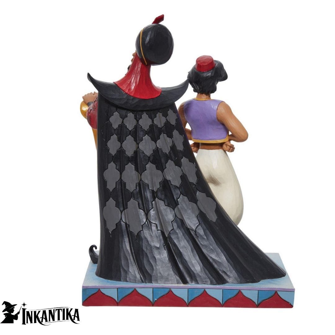 Aladdin e Jafar, protagonisti del classico Disney, sono raffigurati insieme in questa scultura ricca di dettagli e contrasti, simbolo eterno di coraggio, ambizione e magia.