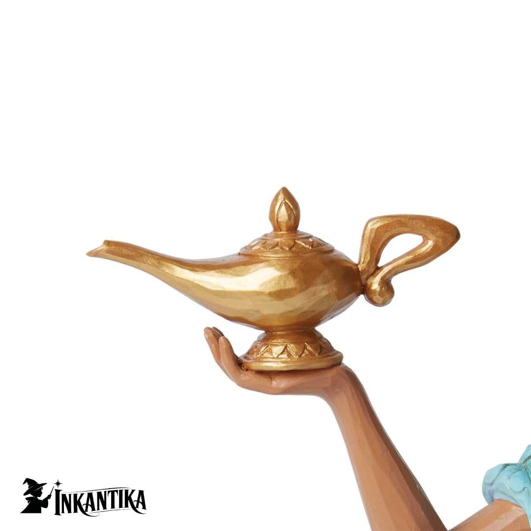 La scultura ritrae Jasmine in un momento di pura grazia, con l’abito turchese decorato e la lampada magica in mano, simbolo del suo destino intrecciato con Aladdin e il Genio. I dettagli scolpiti a mano e la finitura brillante rendono ogni esemplare unico e ricco di fascino orientale.