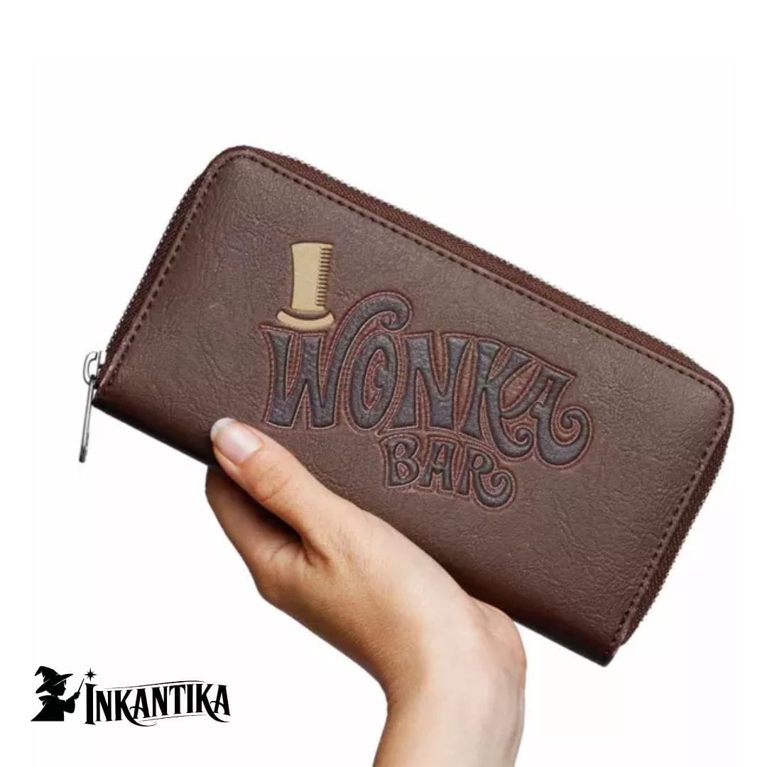 Un portafoglio ispirato al magico universo di Wonka: portafoglio “Choco” in marrone, con spazi per carte, banconote e portamonete, design elegante da film fantasy.